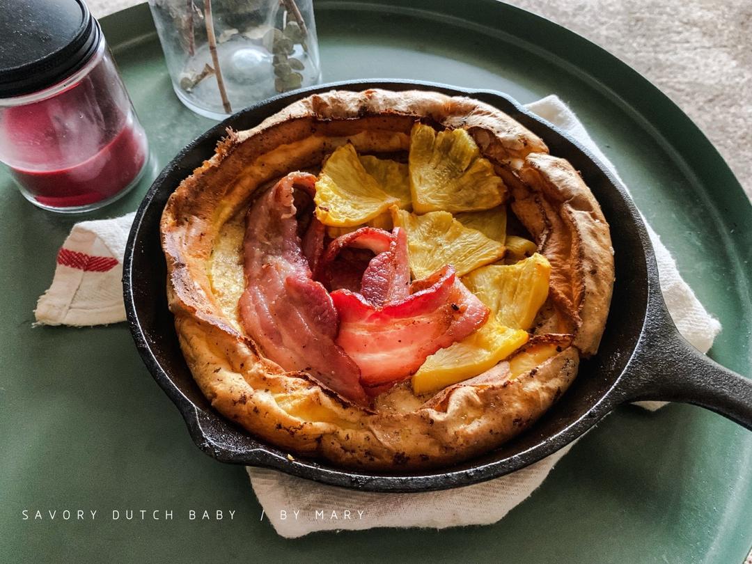 这次的Dutch Baby烤的比较成功,口味搭配的也蛮好,咸咸的培根加酸甜的烤菠萝,开心。