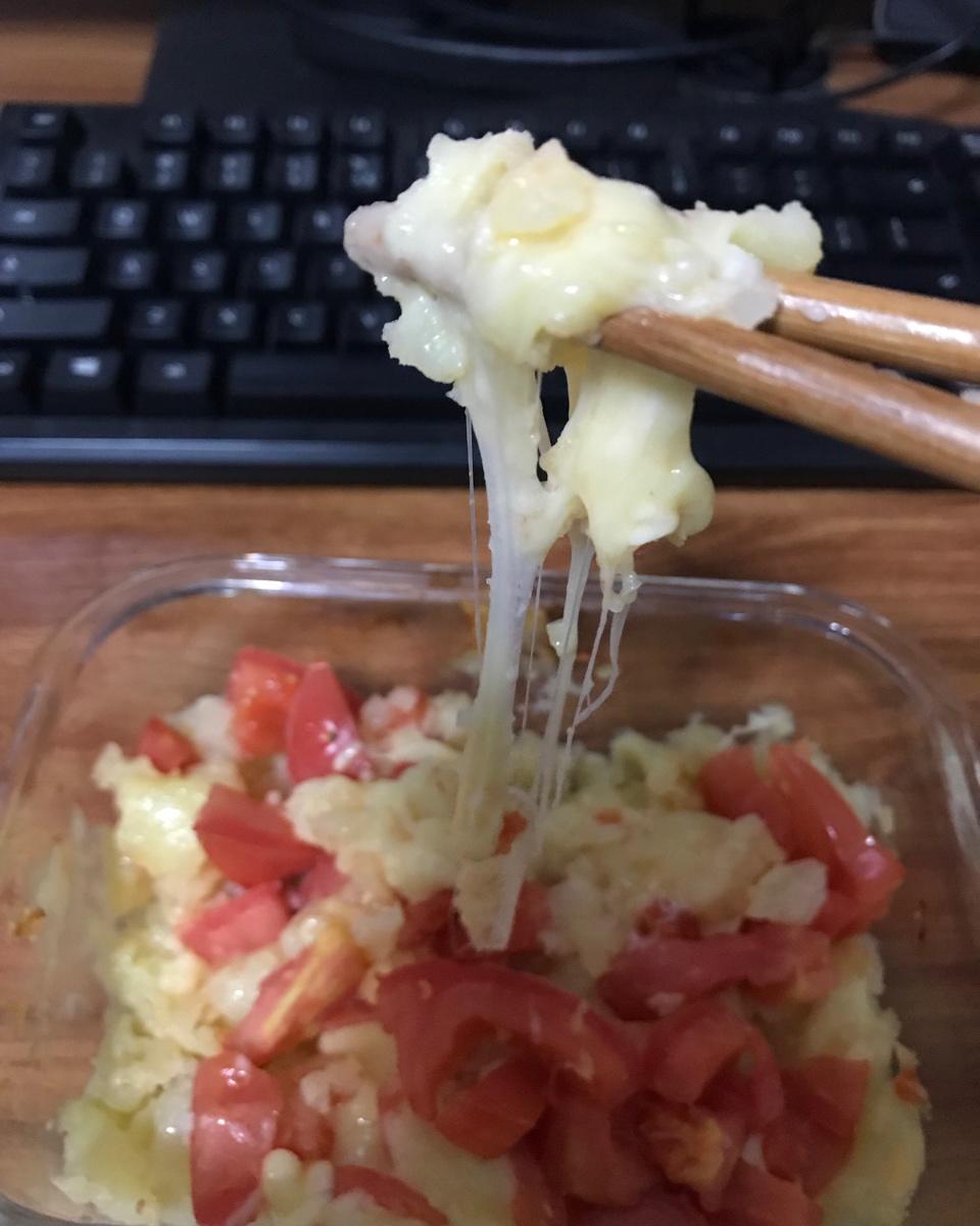 蒸好的土豆压泥,西红柿切小块,撒马苏里拉芝士,霍霍进烤箱~美滋滋