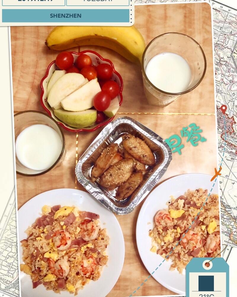 藜麦培根🥓🦐🥚炒饭+烤鸡翅+牛奶🥛,速度得加快版,才赶得及给上学的👭