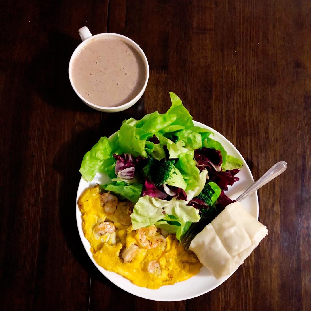 蔬菜沙拉,鲜虾抱蛋,肉龙,红枣核桃杂粮粥。