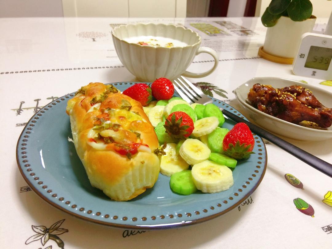 为儿子准备的💗早餐:香葱芝士餐包、照烧鸡翅根、黄瓜香蕉、麦片牛奶