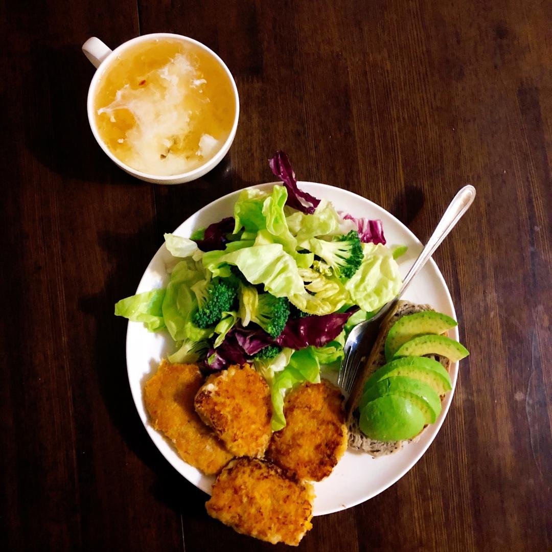 蔬菜沙拉,香煎虾饼,欧包配牛油果,桃胶皂角米银耳牛奶羹。