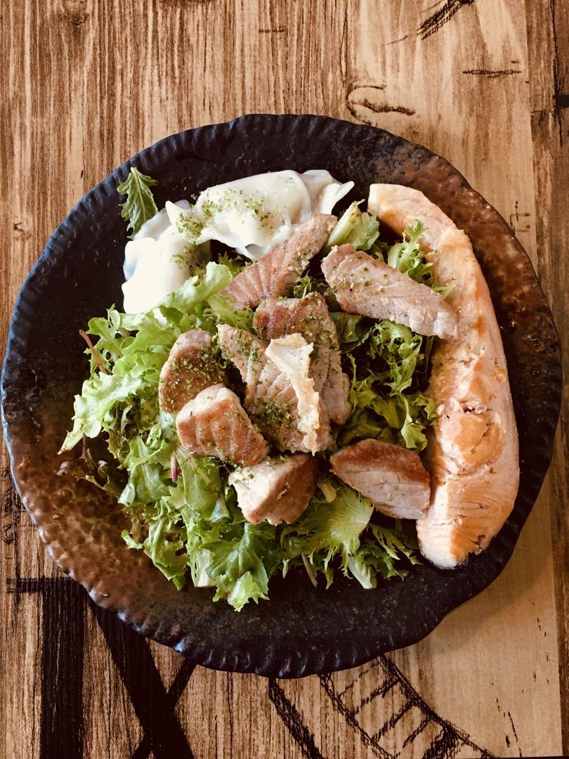 煎香三文鱼加呑拿鱼沙拉再加两只饺子=美味不增肥。