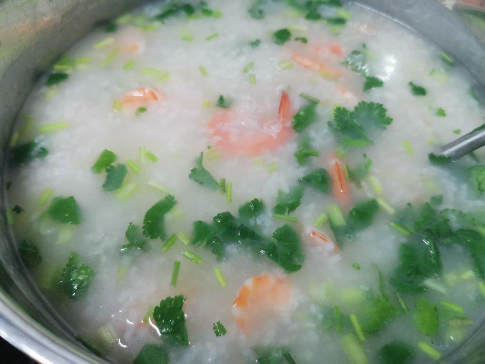 鲜虾去虾线,开边。虾头熬了虾油倒入。用了两大勺冬菜(清洗过),起锅后放入香菜。虾甜粥鲜,
