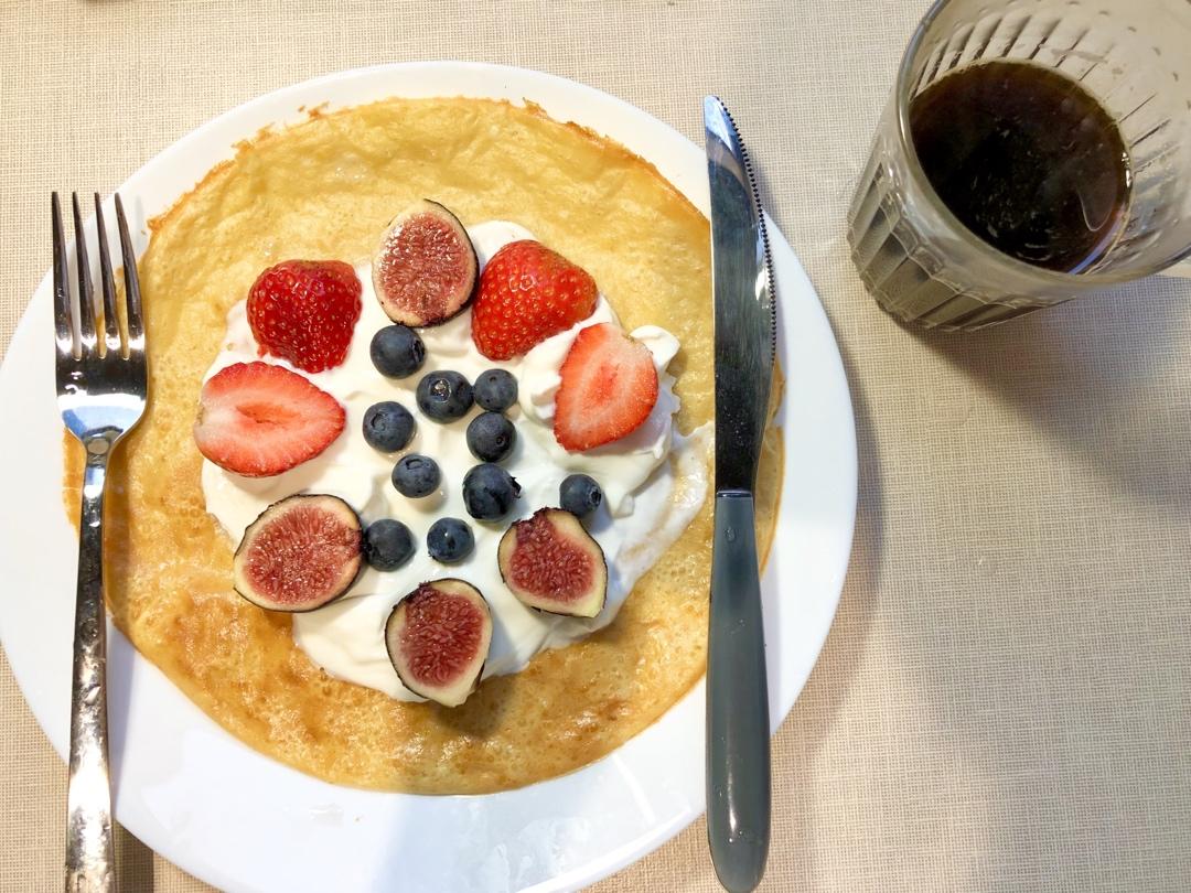 #早餐•2020年1月19日# 可能是用的平底锅太大了,想做荷兰松饼但周围一圈完全没长起来…但也不影响吃啦,各种水果泡在冰岛酸奶里和饼一起吃下去,还是美味的!