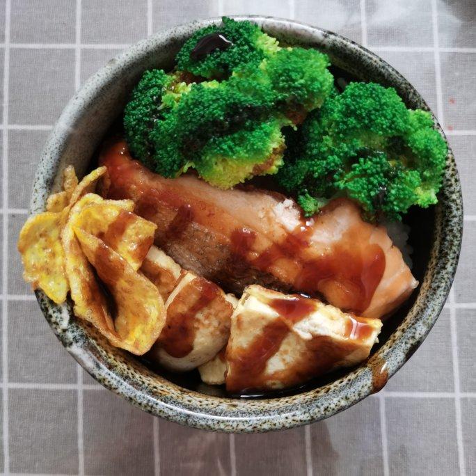 直接平底锅煎熟三文鱼,牛油果热量太高换成西兰花,加豆腐和鸡蛋。