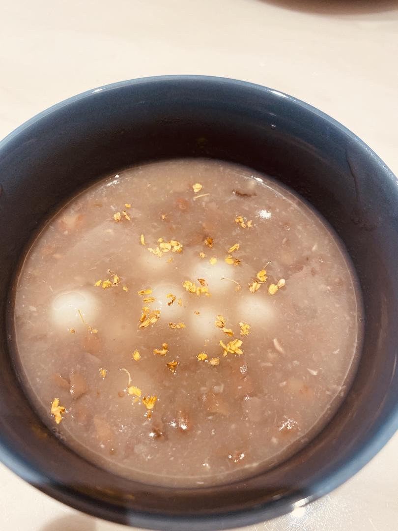 陈皮是陈李济五年陈皮,用的鲜红豆省去了泡但也煮了2小时,压出沙,小圆子煮好泡冷水,最后撒上桂林旅游买的干桂花