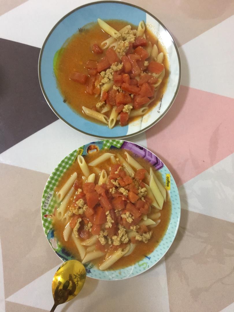 我女儿喜欢吃有汤的,我材料简单很简单番茄切丁,肉末炒变色➕番茄丁加半碗水一勺白糖加番茄酱煮滚加纯奶30ml滚了加适量黑胡椒粉出锅