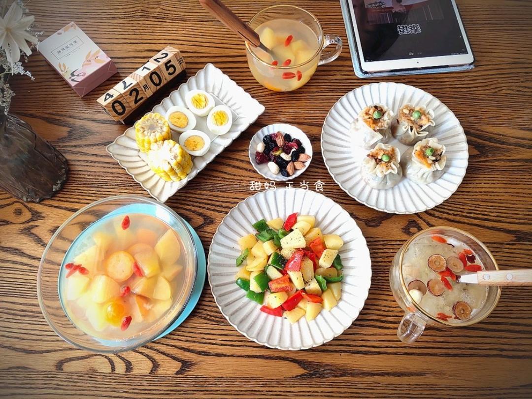 甜甜Molly 做过 早餐•2020年2月5日 #早餐•2020年2月5日# 20200205周3寒假~阳光明媚,疫情别大意,继续窝居,加油!今日早餐:肉松蛋黄烧麦~土豆双椒~玉米鸡蛋~银耳羹~金桔苹果糖水~坚果[爱心] 2020-02-05