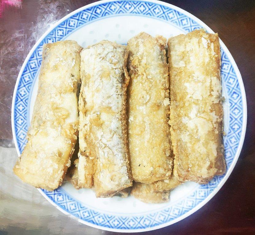 干炸带鱼,简单腌制裹上生粉,过油炸,吃的时候放到空气炸锅180°5分钟,不不会那么油腻,吃起来更健康!