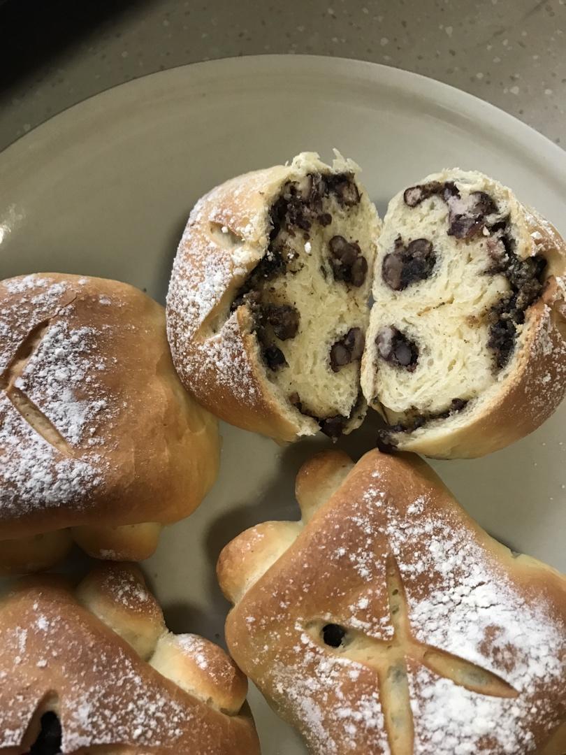 宅家里想吃面包,自己动手,味道不错,用了红豆馅(自己做的)和蔓越莓核桃馅(特好吃😋),用的面包机和面和发面简单,就是时间长了一些,还是值得的😄