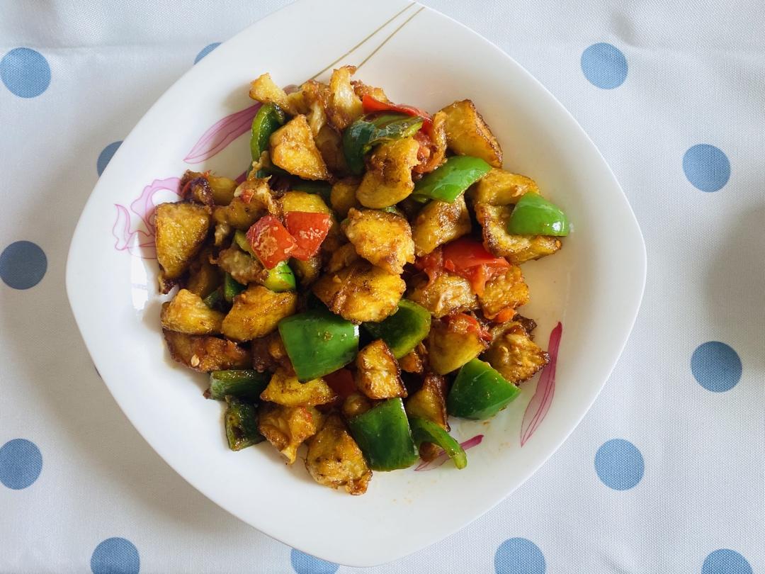 将茄子🍆洗净,刮皮,切成滚刀块,裹少许淀粉备用。将西红柿🍅和大辣椒洗净,切块备用。