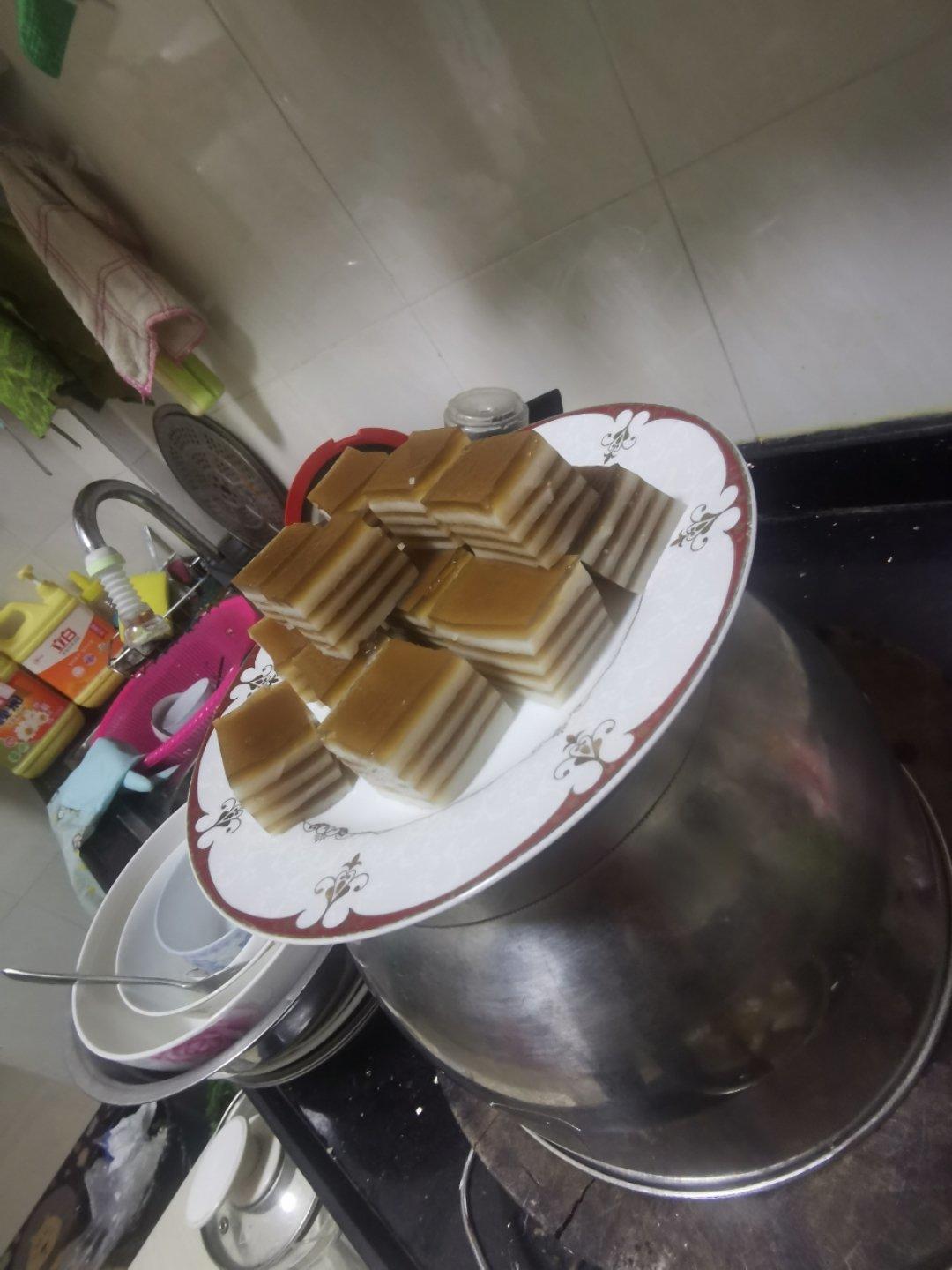 happy梁 做过 夏日清爽小点心:红糖椰汁千层马蹄糕 椰浆层我椰浆 只有290克 其余都是牛奶克数 用半斤马蹄粉250克 椰层125马蹄粉 黄糖层125 对1500克水黄糖 椰浆各半的方法蒸 糖黄糖层162克 椰层150克 甜而不腻 不喜欢吃不够甜的甜品 这样没有灵魂 2020-02-11