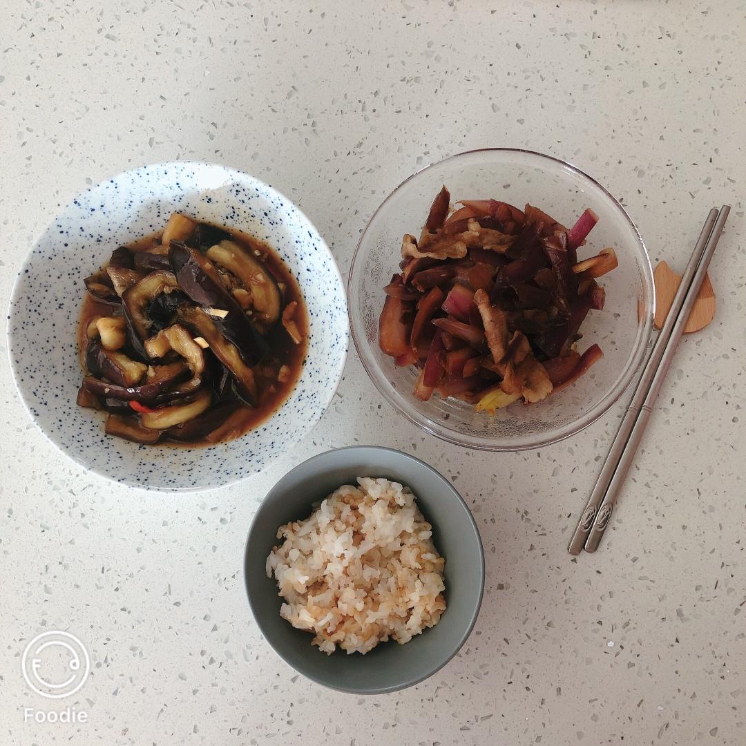 鱼香茄子+洋葱炒羊肉+杂粮饭