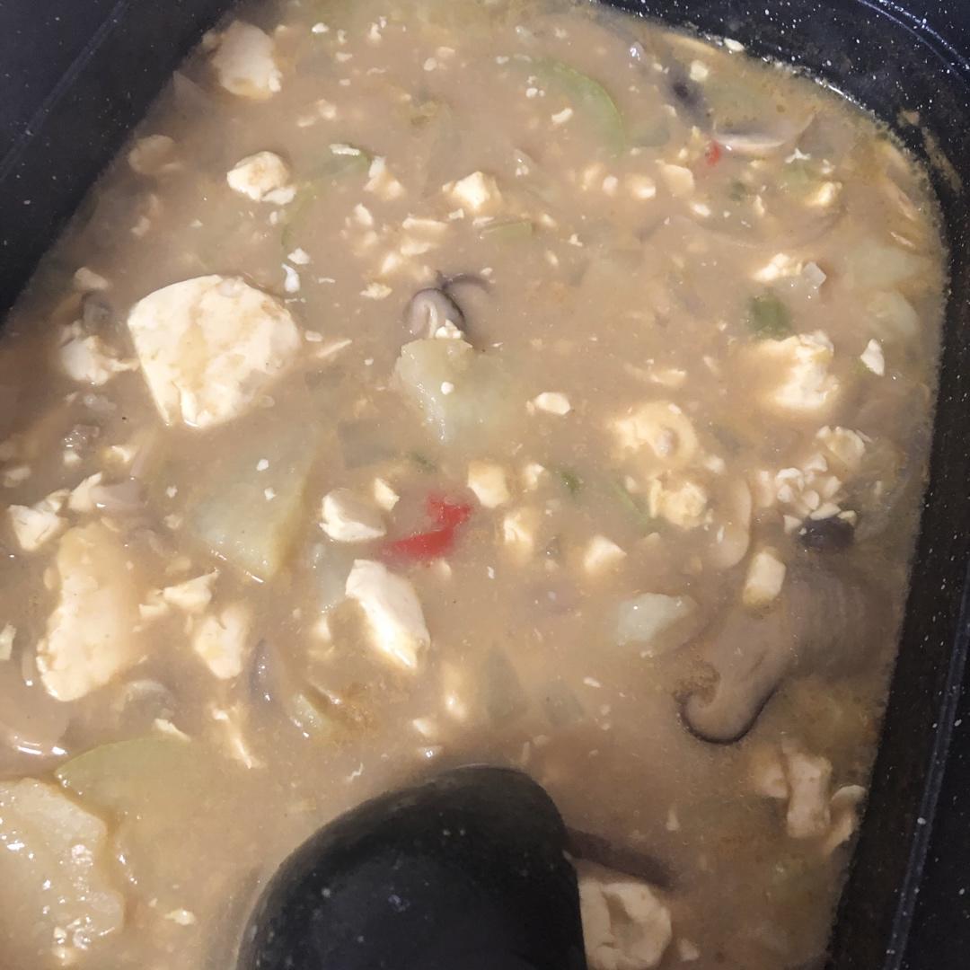 实在买不到大酱和辣酱,就放了两块咖喱,两勺芝麻酱,一点点盐,炒蘑菇的时候磨了点黑胡椒进去,味道还可以,就酱。