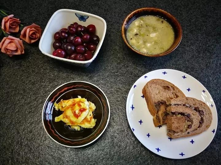 坚果欧包•ᴗ•鸡蛋沙司•ᴗ•车厘子•ᴗ•白菜豆腐小米粥
