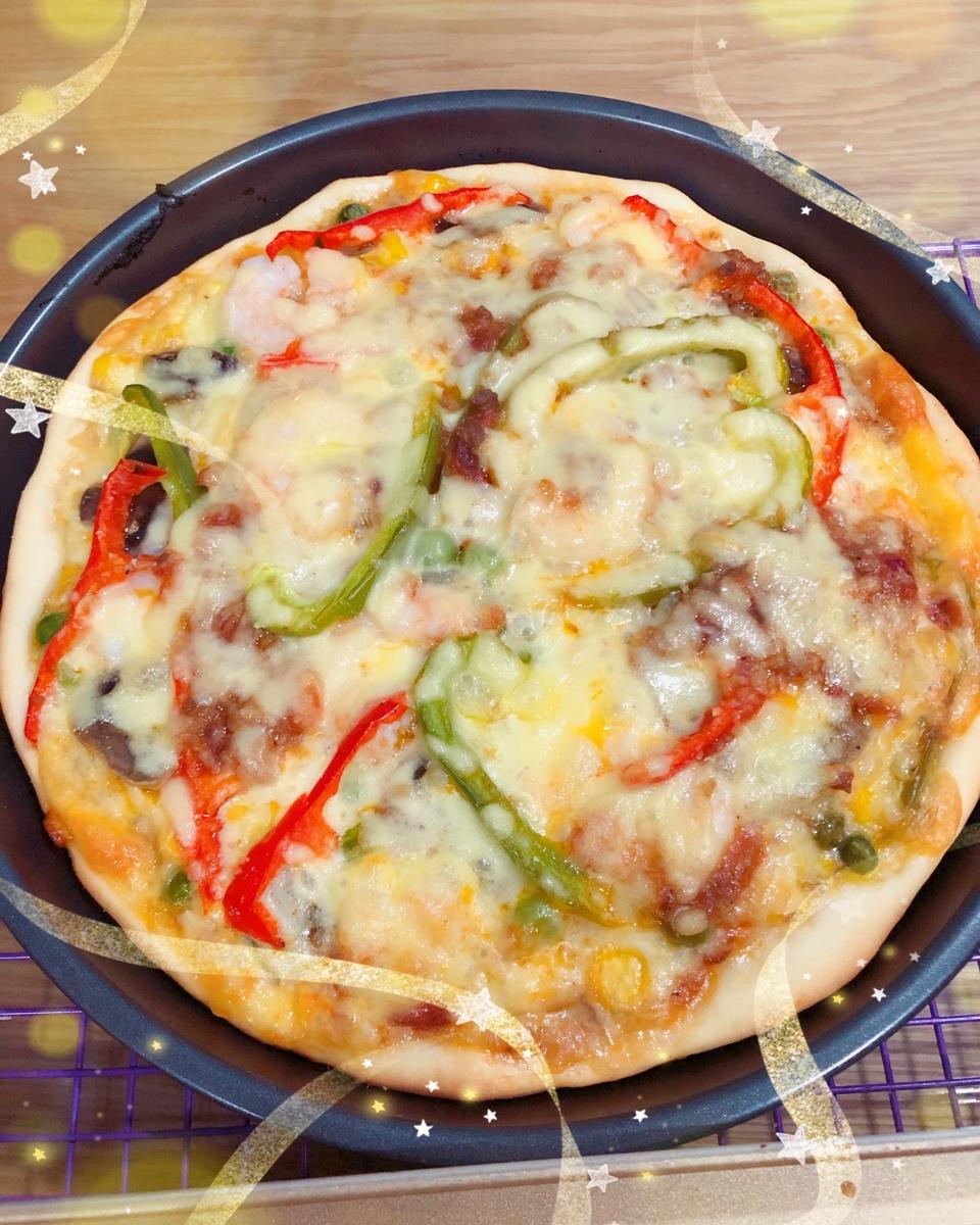 肖肖肖夫人 做过 至尊披萨【制作要点更新】 #晚餐•2020年2月23日# 果然蔬菜多了水多,按照家里仅有的材料,我放了:青豆,玉米粒和蘑菇~用盐抓了下然后在锅里干煸至没有明显水分;虾也是用的冷冻虾仁用少量料酒和盐抓了直接放的;还放了彩椒。方子的红酱真的是一绝👍!面皮也是!女儿很喜欢这面皮~美的绅士烤箱:200度烤20分钟 2020-02-23