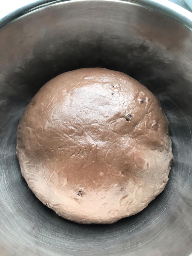 3⃣️将巧克力豆加入面团,揉匀,进行第一次发酵(28度),面团发至2-2.5倍大,