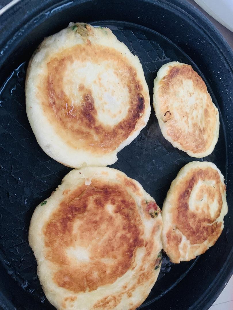 头天晚上把面粉加酵母盐糖水油搅和至光滑略软面团 放入冰箱冷藏发酵 第二天早上拿出来回温直接包馅子入锅煎至金黄即可