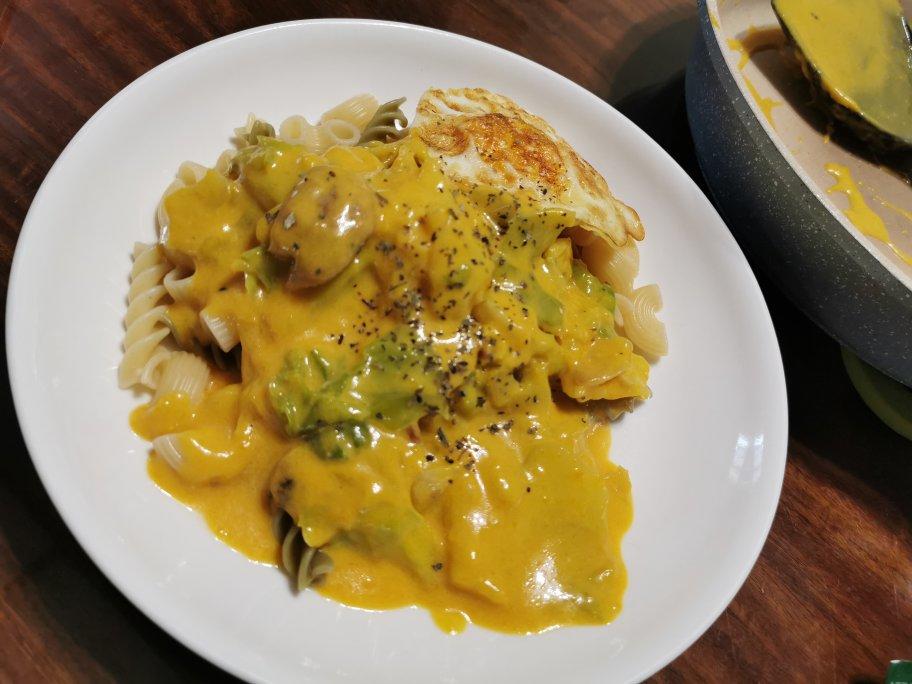 为食牛奶妹 做过 南瓜香肠意面 非常时期有啥用啥😂 用牛奶代替了奶油,更低脂健康;南瓜去皮微波炉叮几分钟,加奶加盐料理棒打汁待用;包菜手撕加烟肉/肠炒熟;螺丝粉煮好上碟,倒入南瓜汁OK。 2020-03-01