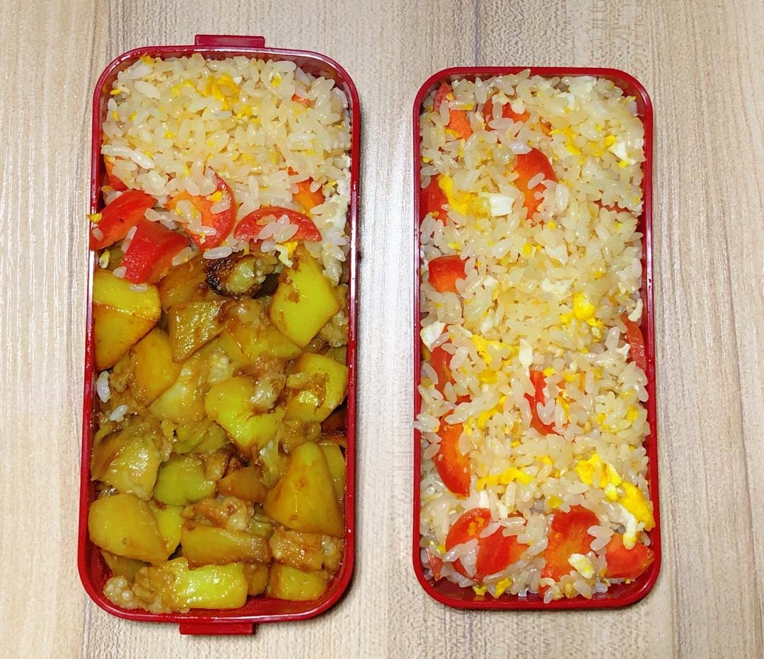 补个午饭。蛋炒饭+地两鲜(我没有青椒)。萝卜有点硬,没有吃完,头晕也不想吃。