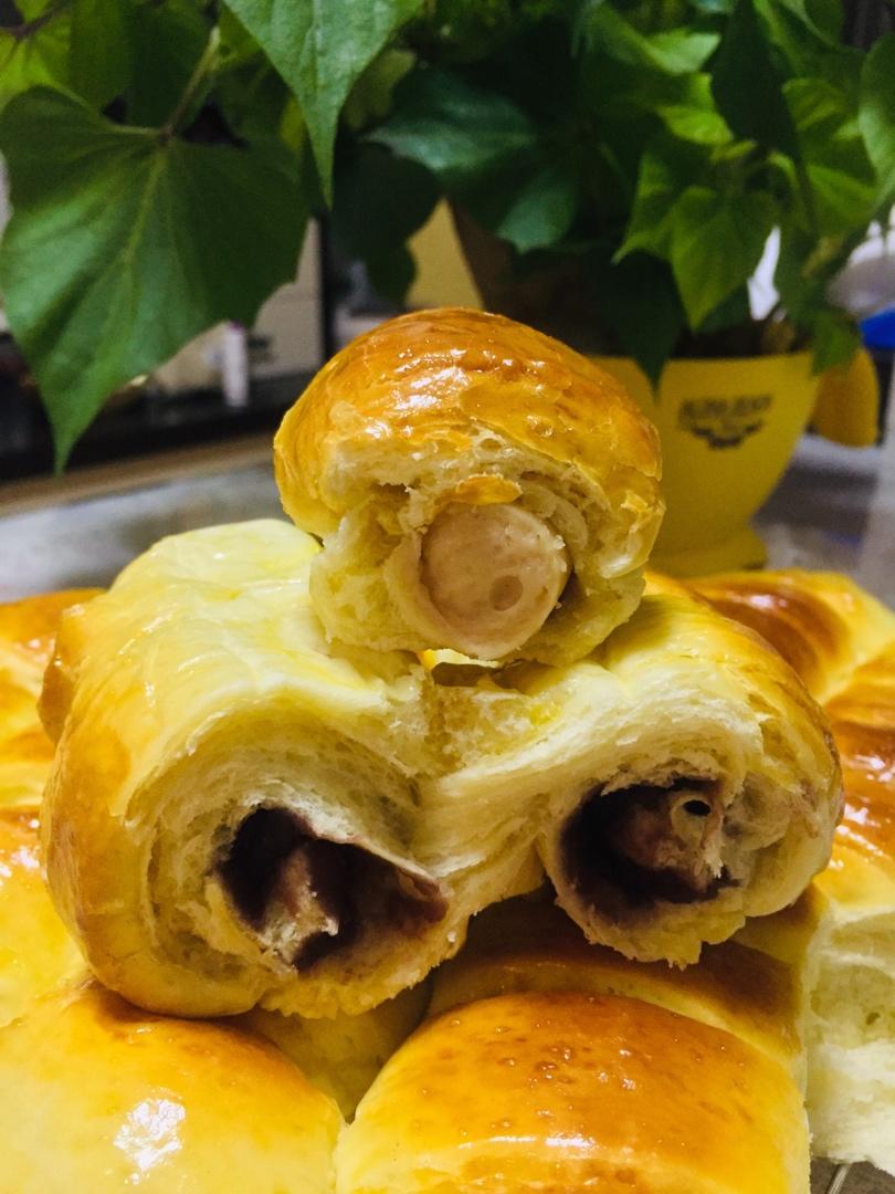 利用家中现有食材,以红豆沙、一口香肠为馅,👌