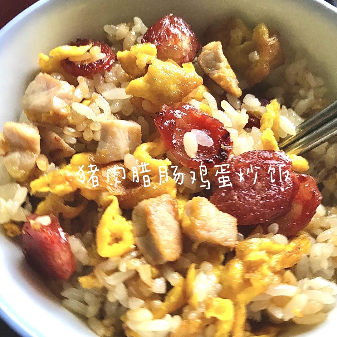 5⃣️接着倒入腊肠 加入适量米饭🍚