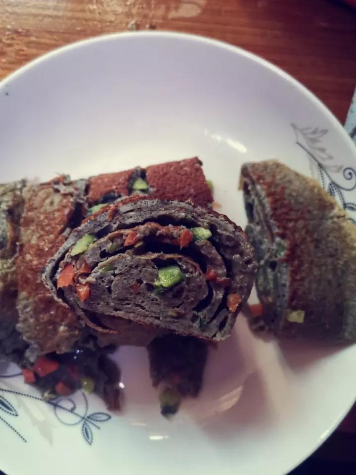 自己加了点黑芝麻黑豆粉,外酥里嫩的黑色的鸡蛋卷也别有一番滋味呢(o^^o)