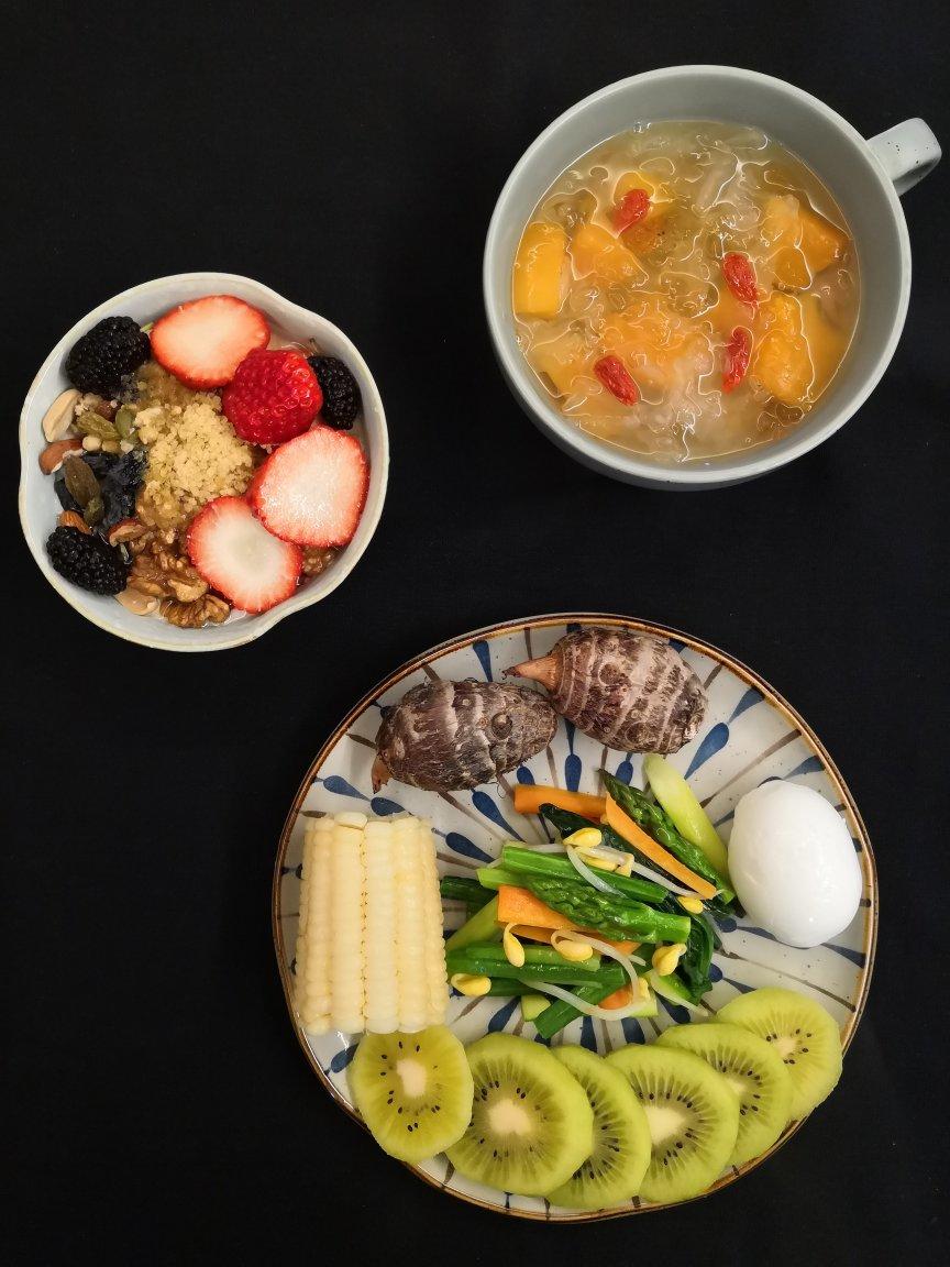 酸奶 木瓜白木耳桃胶 玉米 芋艿 白煮蛋 芦笋杂蔬菜 猕猴桃