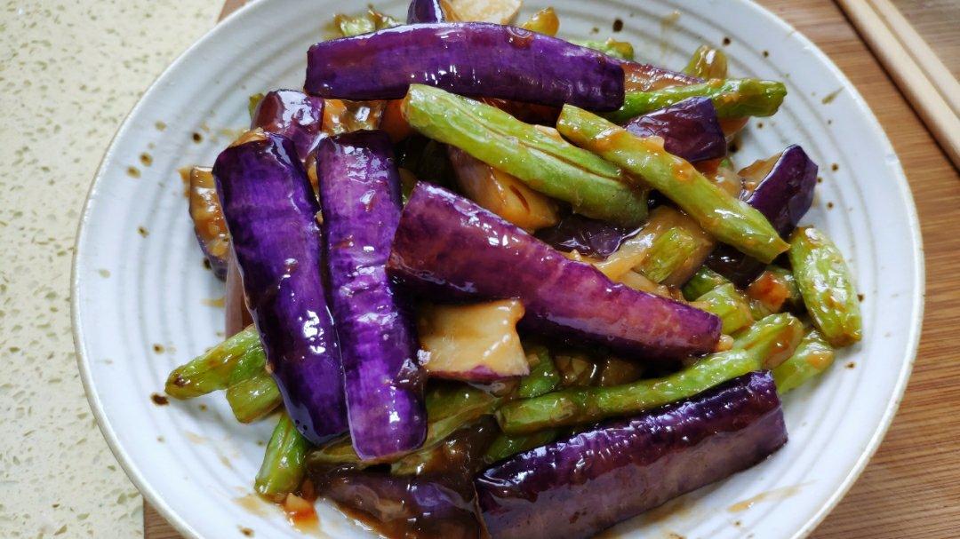 ⑤锅中加入少许油,下入蒜末和干辣椒炒香,放入炸好的豆角和茄子,加入调好的料汁翻炒几下,挤入水淀粉翻炒出锅。