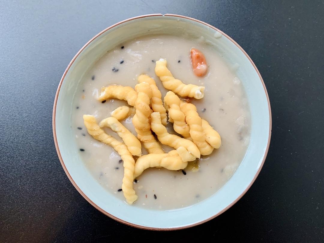 大王做美食 做过 【陕西油茶】史上最方便面食,陕西的民间智慧! 特意在网上买了牛油和杏仁,还放了南瓜子,炒的够火候,就是小时候吃的味儿,够香!另外,油茶和麻花是绝配,油茶不会把麻花泡软,吃起来口感一流👍🏻#早餐•2020年3月16日# 2020-03-16