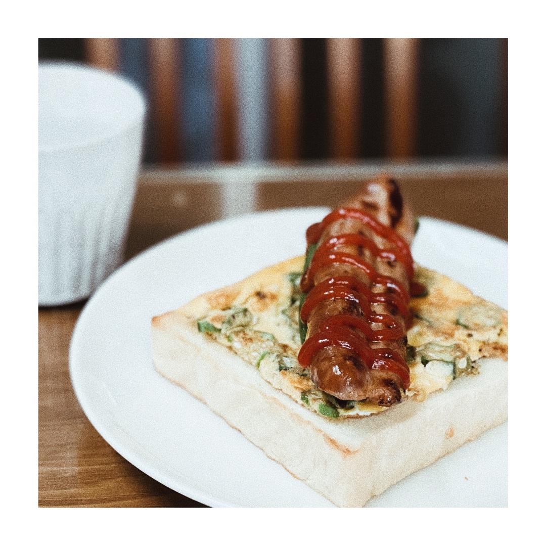 周一:青酱抹吐司进烤箱烤脆,配上烤肠、鸡蛋炒秋葵。