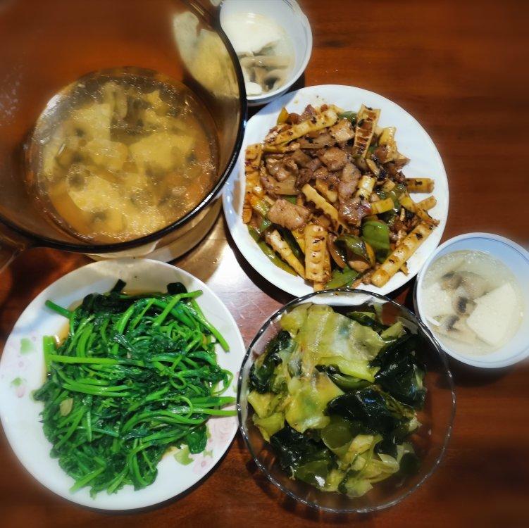 新的一周开始了,晚餐不能马虎。今天晚餐食材丰富:春笋青椒盐煎肉,海带苗拌莴笋,清炒油菜苔,蘑菇豆腐汤,主食南瓜米饭。
