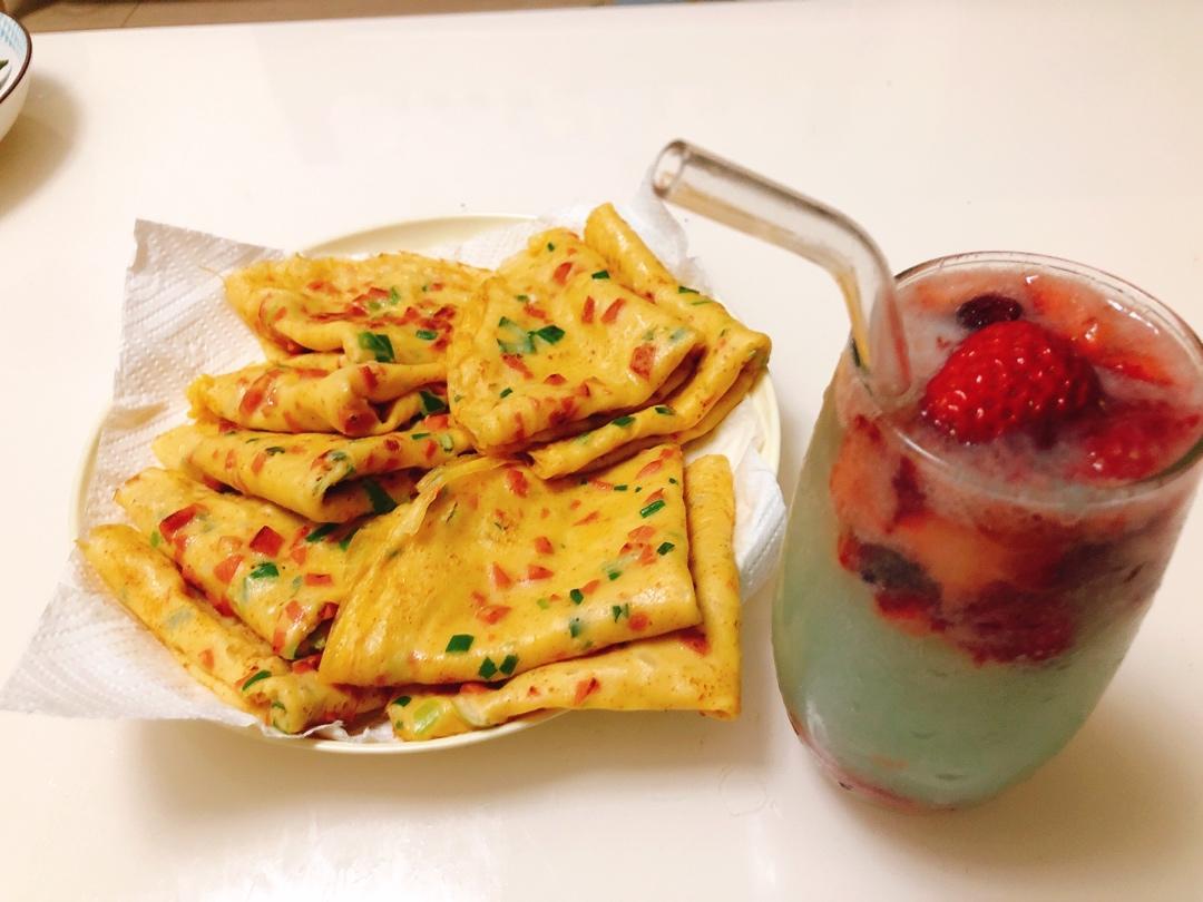 2.用平底锅刷上油,倒入薄薄一层面糊,转动一圈锅,转均匀等待十几秒金黄色用木质炒菜平勺翻面,用筷子和炒菜勺卷上自己喜好的造型摆盘。