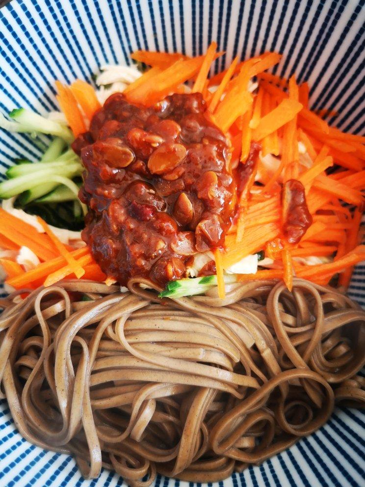 黄瓜胡萝卜鸡胸肉丝+荞麦面+黄豆酱+煎蛋拌面