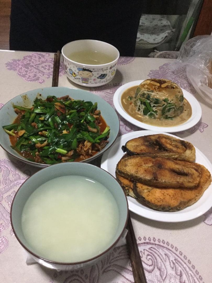 上班的辛苦了:海螺炒韭菜,煎三文鱼,麻酱波菜金针菇