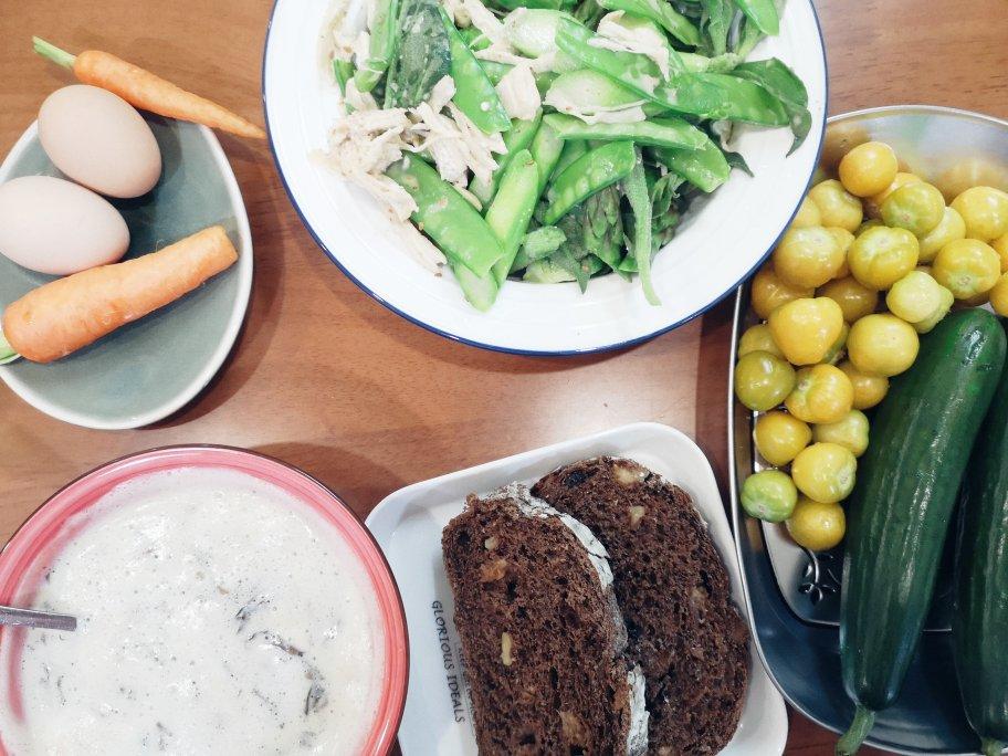 咸豆浆+全麦核桃欧包+鸡丝蔬菜沙拉+水煮蛋+小黄瓜+灯笼果+小胡萝卜