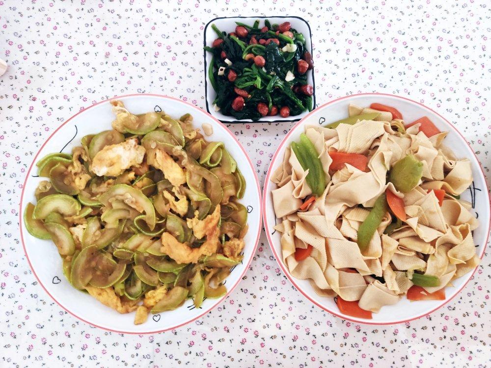 西葫芦炒蛋+炒干豆腐+果仁菠菜