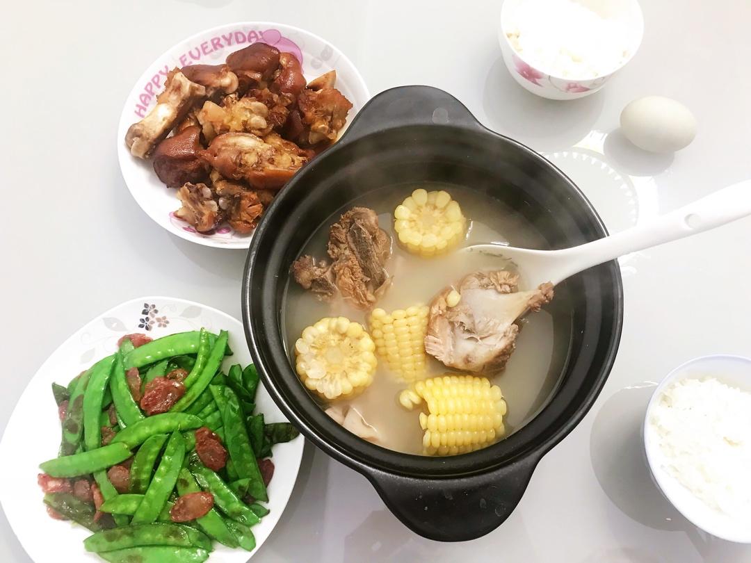 红烧猪蹄,排骨玉米莲藕汤和荷兰豆炒腊肠🥢