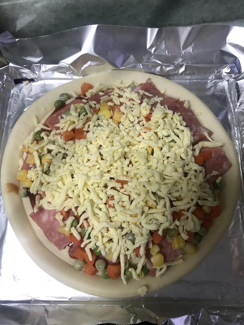 CHENff 做过 2020年04月04日 披萨皮是现成的,直接涂上番茄酱,接着铺一层妙可蓝芝士,然后铺上培根🥓,撒上青豆、玉米🌽粒、胡萝卜🥕颗粒,在给它铺上妙可蓝芝士,旁边放一圈菠萝🍍片,最后在表层撒些黑胡椒粉和椒盐,送进烤箱了 2020-04-04