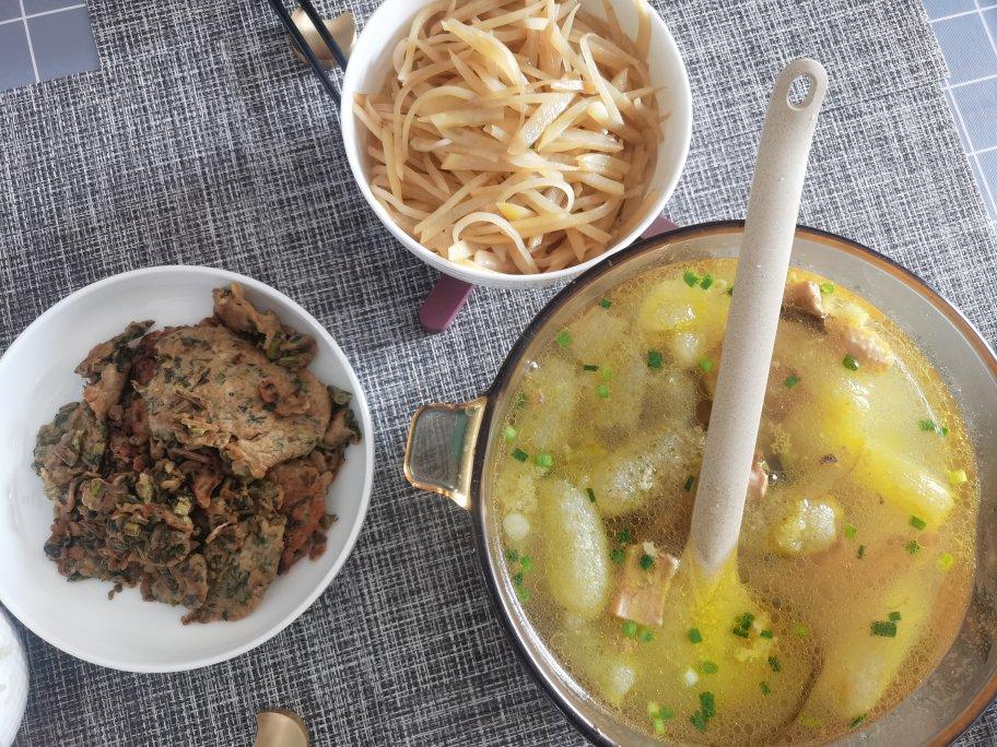 清明小长假第一天,香椿鸡蛋饼+醋溜土豆丝+竹荪鸡汤=一扫空