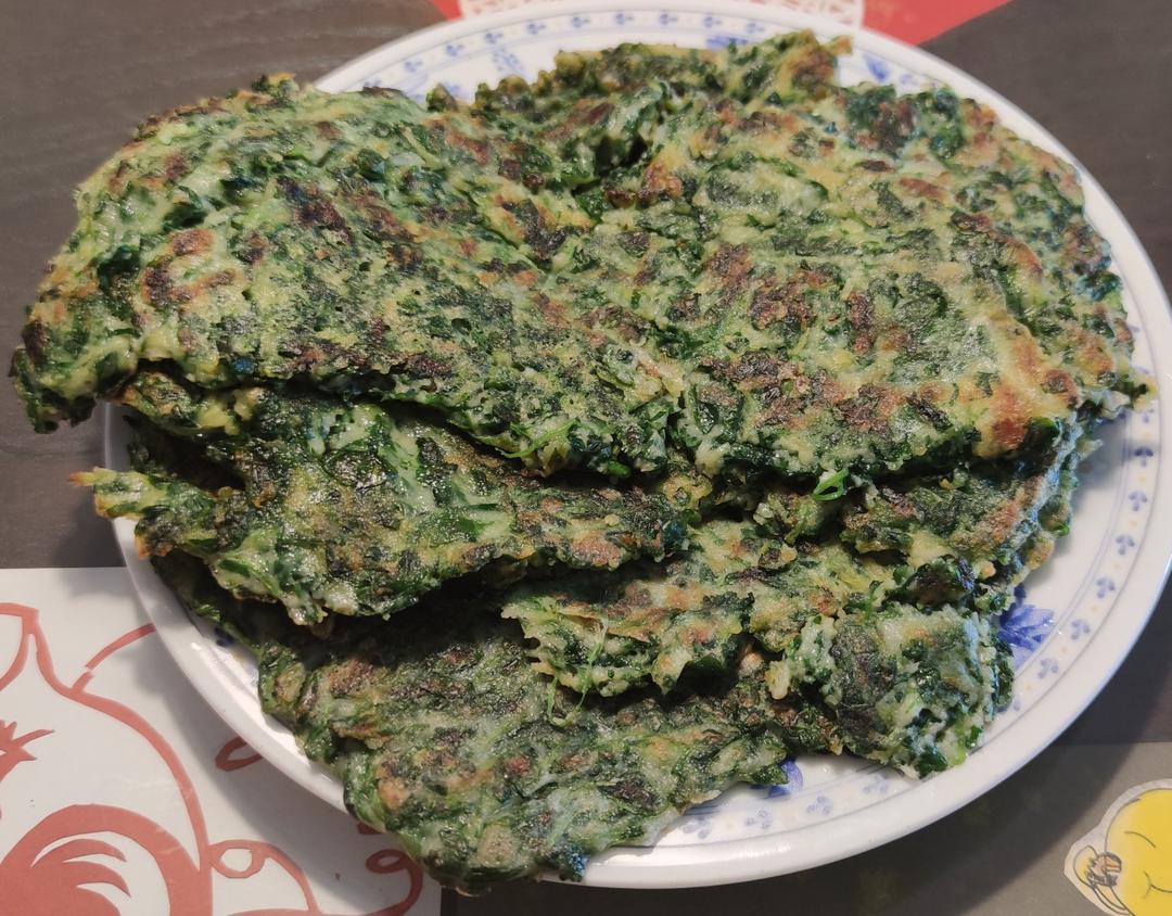 锅内放少油,以一汤勺的量做一个饼,饼入锅后,用锅铲将饼铺开,煎至两面变硬即可。