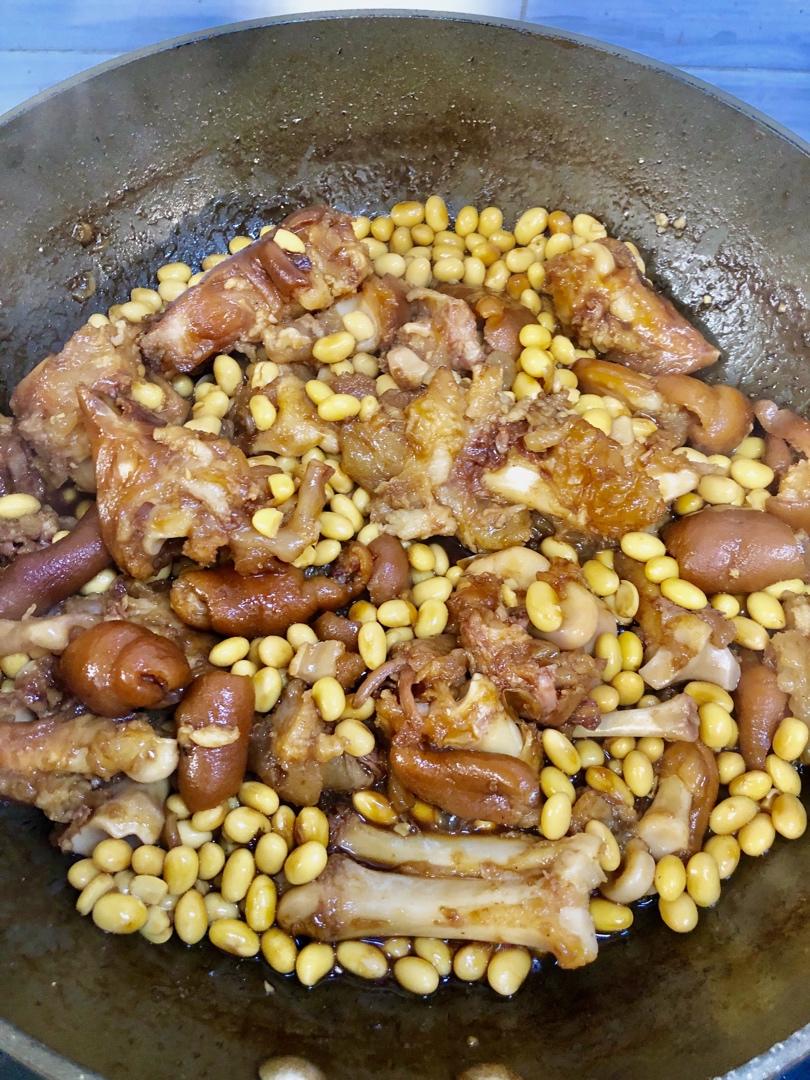 用的麻麻做好的熟猪蹄,把黄豆煮好了直接把猪蹄放进去煮煮煮~香香糯糯