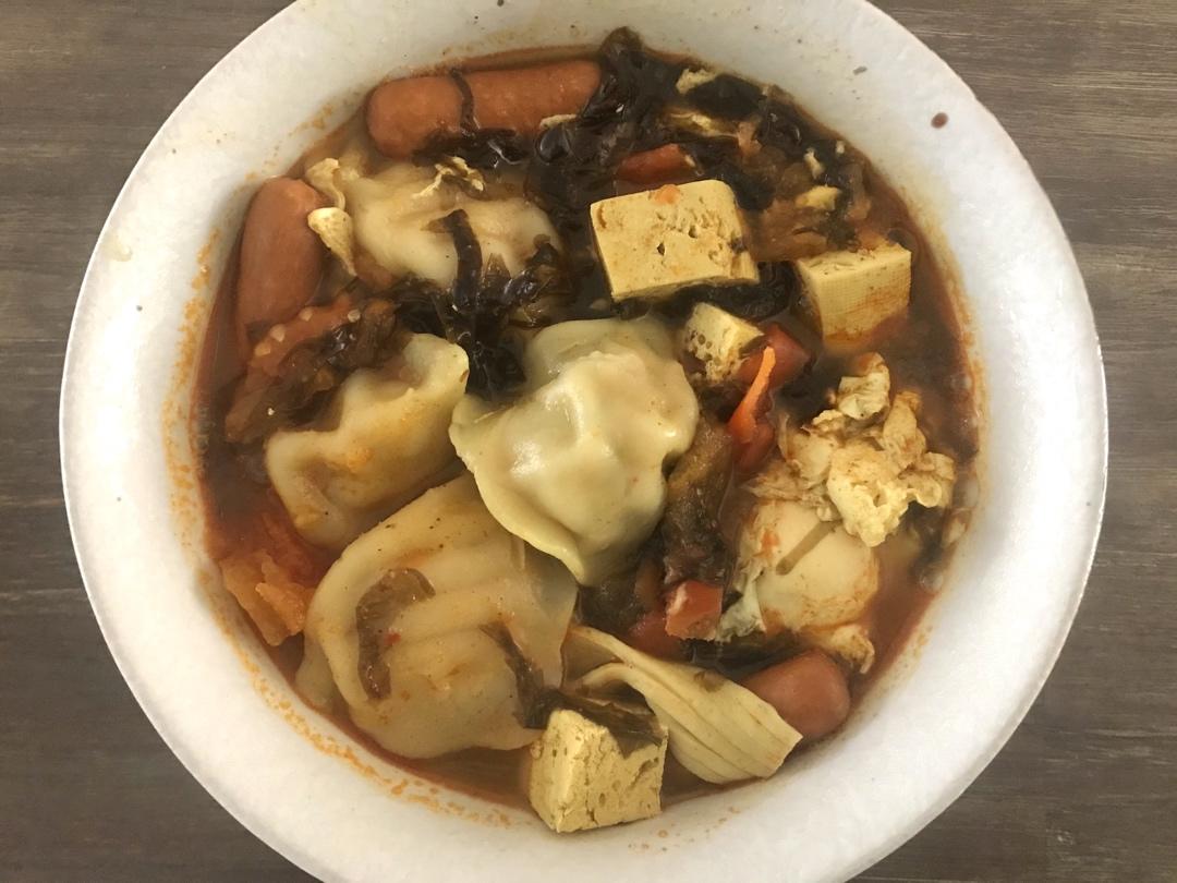 饺子+鸡蛋+紫菜+番茄+香肠+蟹棒+豆腐+豆皮,还放了咖喱