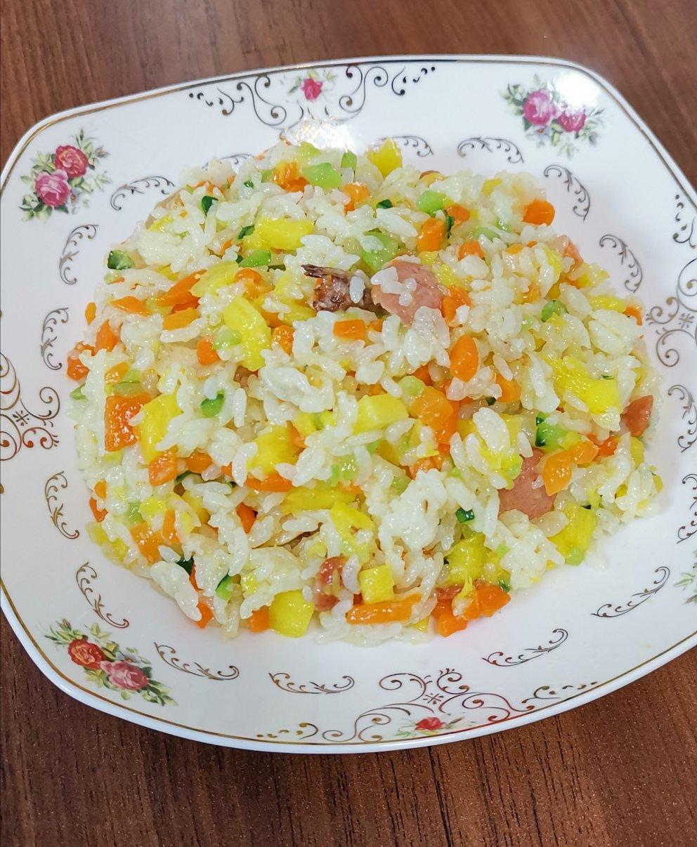 香肠,胡萝卜丁,黄瓜丁炒米饭,加盐,炒好后加菠萝丁,味道很好,这次菠萝有些多,可以少放点。