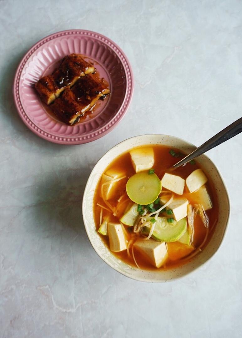 「泡菜豆腐汤、烤鳗鱼」