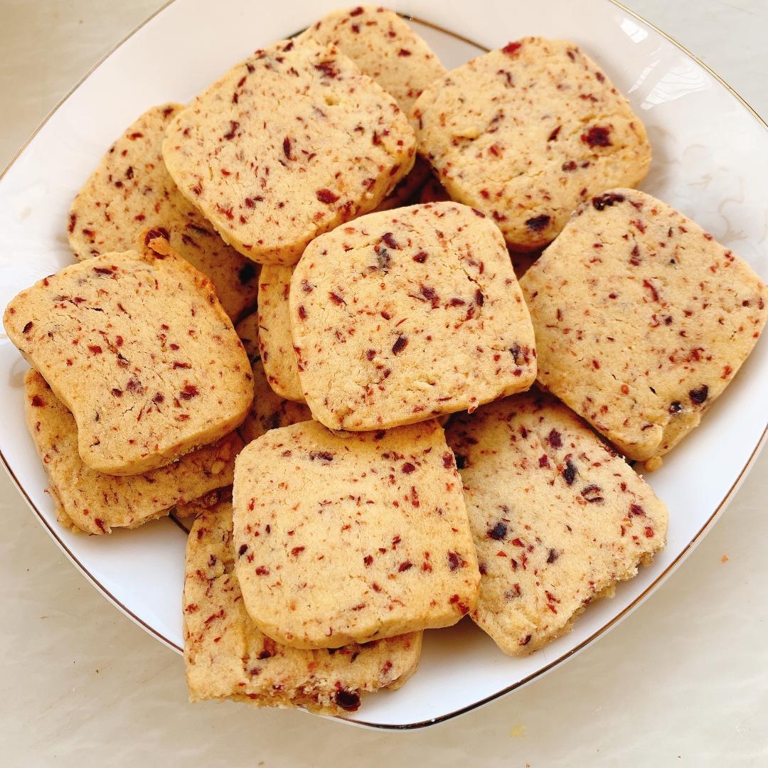 350低筋面粉+150克糖+250克黄油+1个鸡蛋+125克蔓越莓(打碎)
