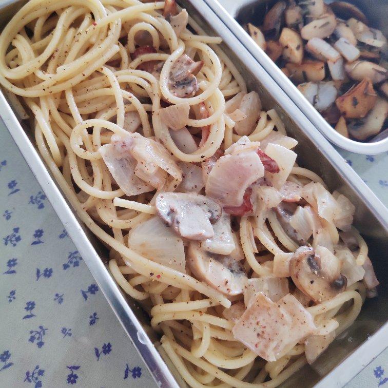淡奶油有点少~~意面作便当不会坨,用苏泊尔自热饭盒加热后也很好吃!
