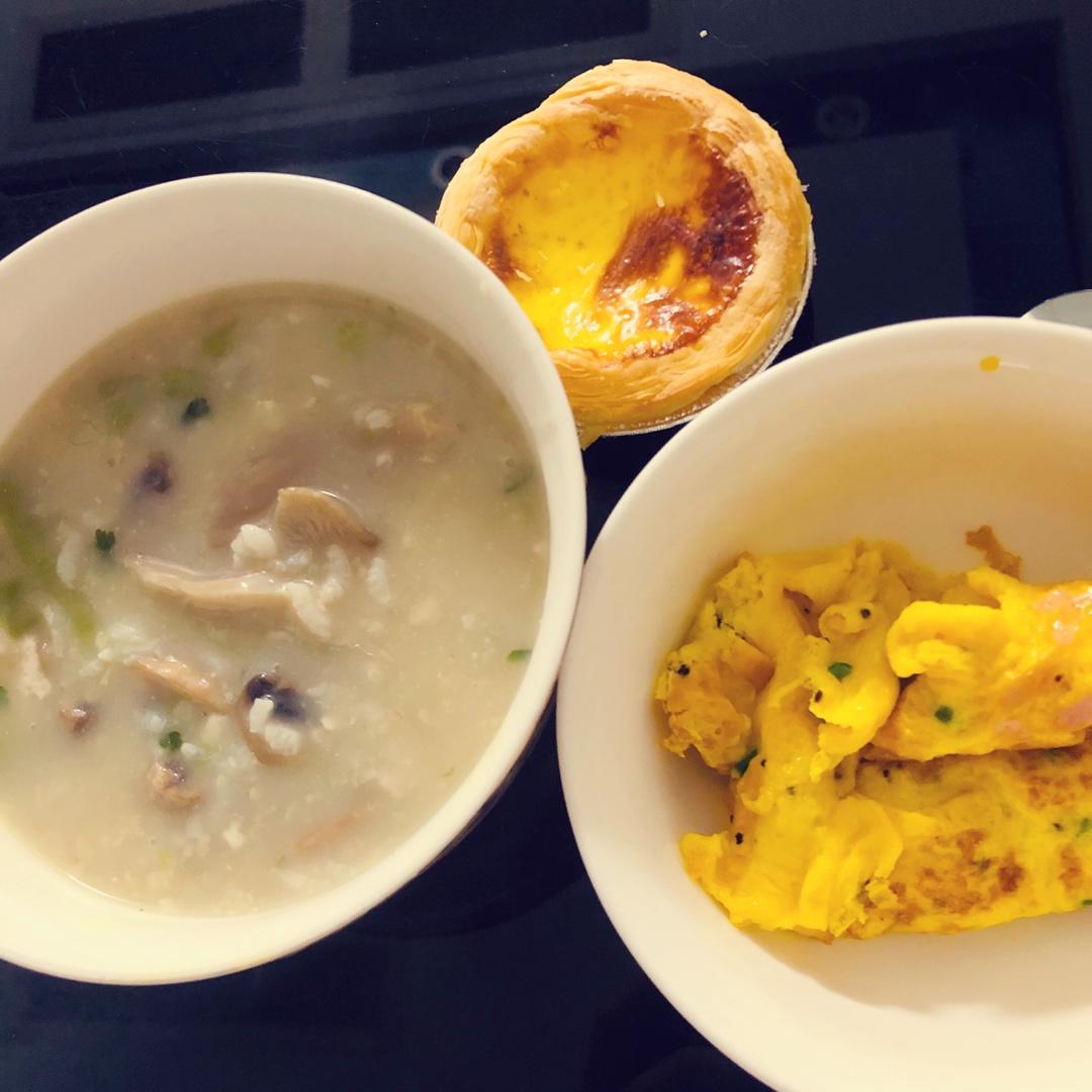 蘑菇鱼汤燕麦粥+火腿黑椒鸡蛋卷+蛋挞~