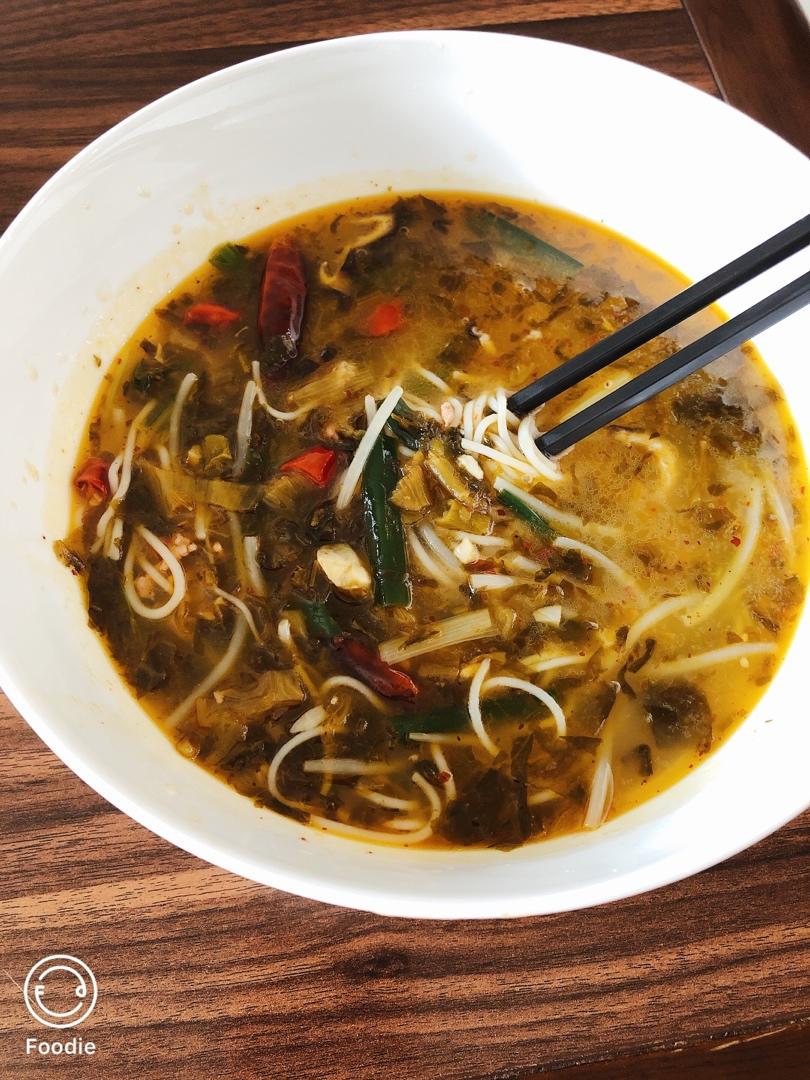 我用的那种真空包免泡米线,云南酸菜,有时候放些海芝宝海带,味道很好。